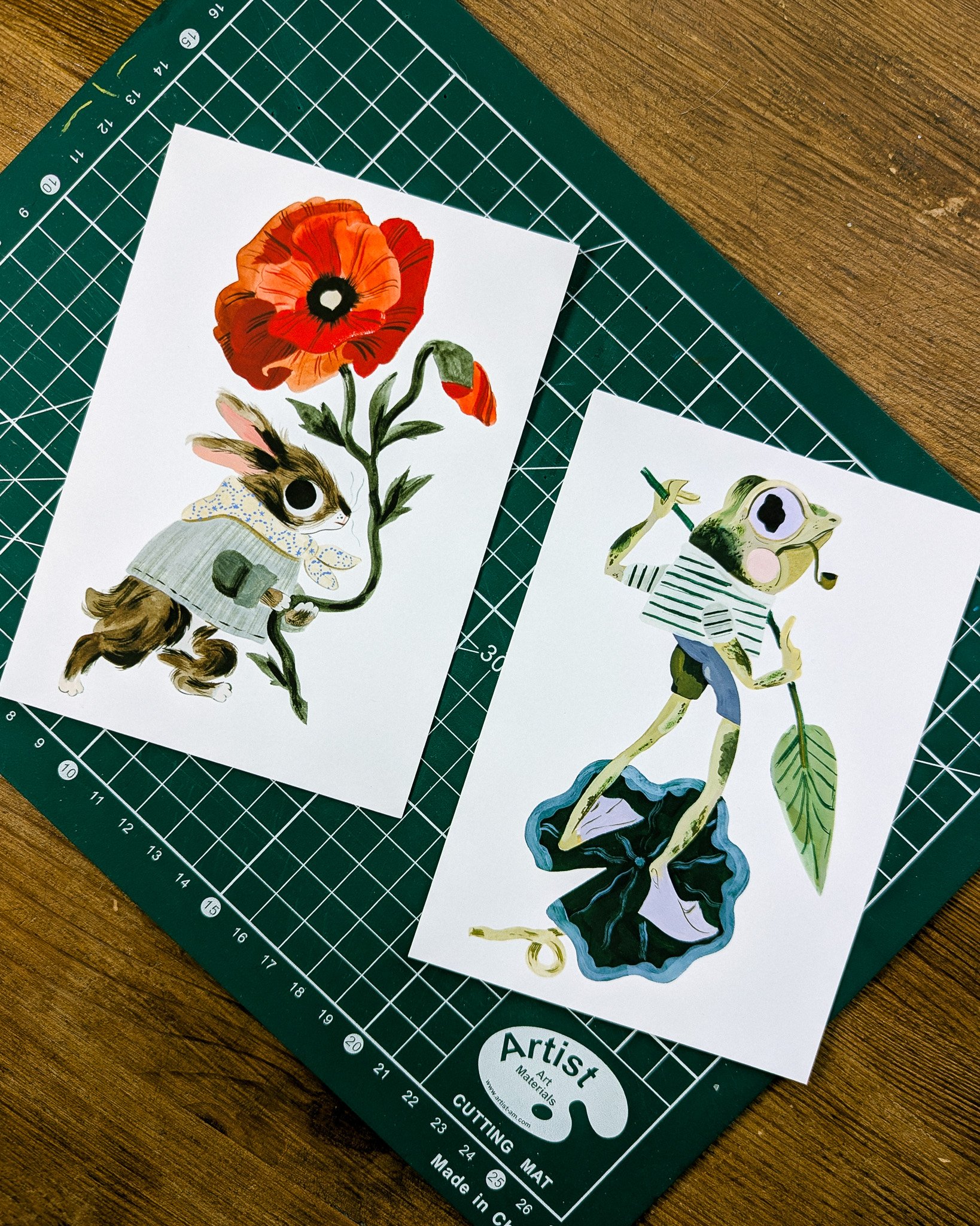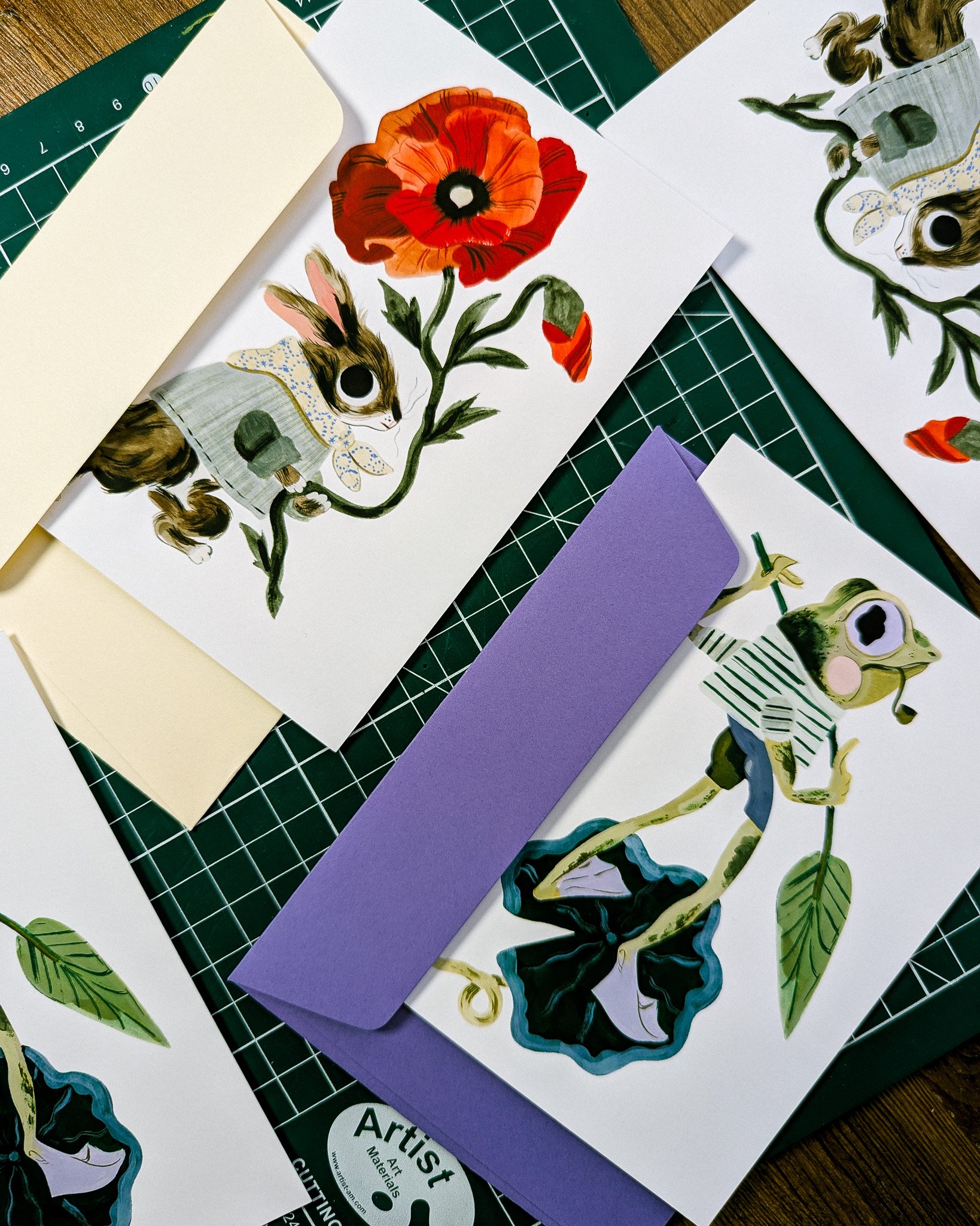 A set of two charming A6 cards. The Rabbit and The Frog are ready to carry kind words to your loved ones. Perfect for thank-yous, celebrations, checking in on a friend, or simply framing as tiny art prints.